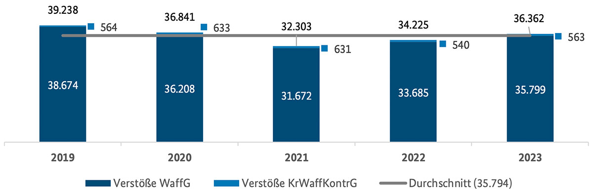 In seinem jetzt veröffentlichten Bundeslagebild Waffenkriminalität 2023 meldet das Bundeskriminalamt (BKA) 36.362 Straftaten mit Waffen, was einem Anstieg der Waffenkriminalität im Vergleich zu 2022 um 6,2 Prozent entspricht. Dabei stiegen die Verstöße gegen das Waffengesetz (WaffG) um 6,3 Prozent, die gegen das Kriegswaffenkontrollgesetz (KWKG) um 4,3 Prozent. Im Vergleich zum Vor-Coronajahr 2019 ist jedoch ein Rückgang um insgesamt 6,6 Prozent zu verzeichnen.