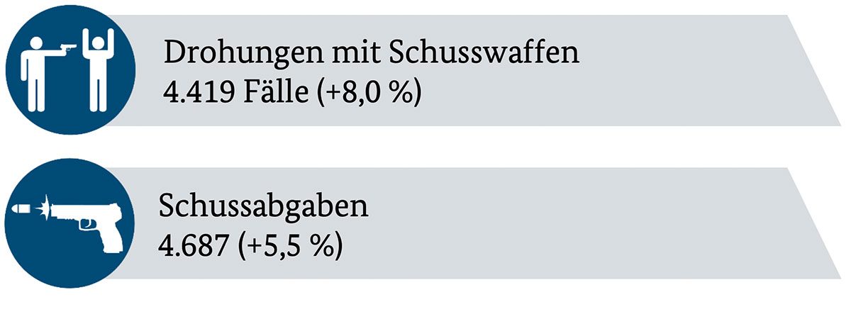 Die im Bundeslagebild ebenfalls veröffentlichte Analyse der Straftaten unter Verwendung von Schusswaffen zeigt ein ähnliches Bild mit einem Anstieg von 6,7 Prozent gegenüber dem Vorjahr, jedoch einem Rückgang gegenüber 2019 um 0,5 Prozent (siehe Grafik).